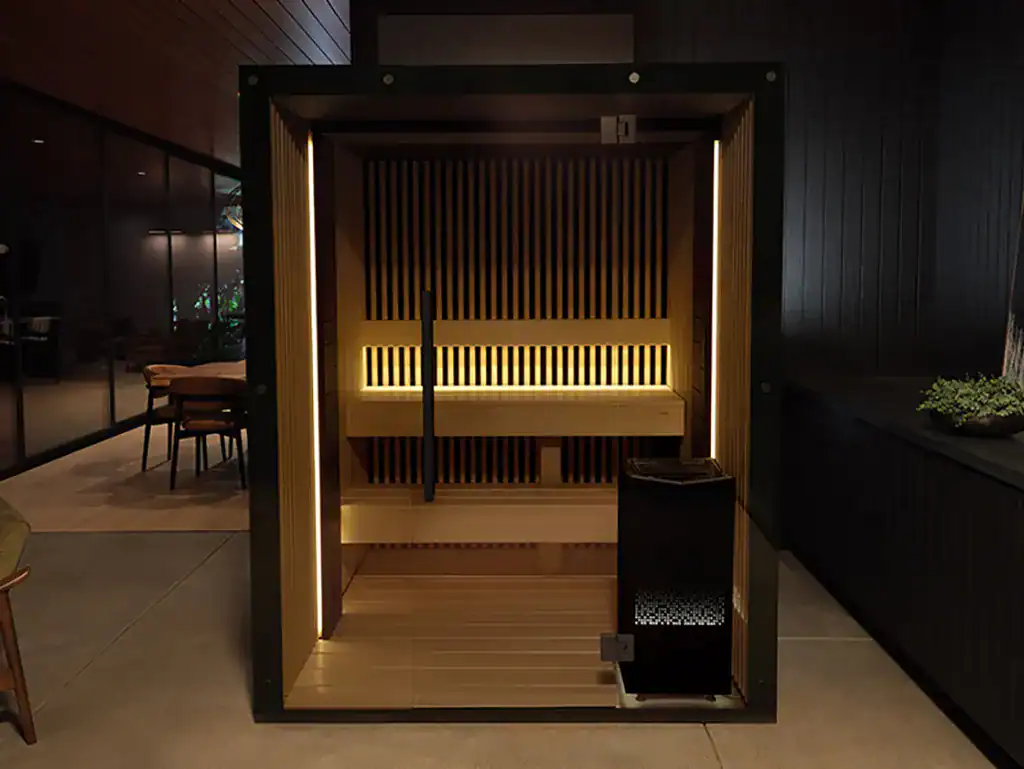 The Tylo Reflection™ 3 is a premium indoor traditional sauna designed for up to three adults. It redefines the modern sauna experience through an architectural blend of high-end materials, advanced Swedish heating technology, and integrated smart features designed for deep recovery and increased circulation.