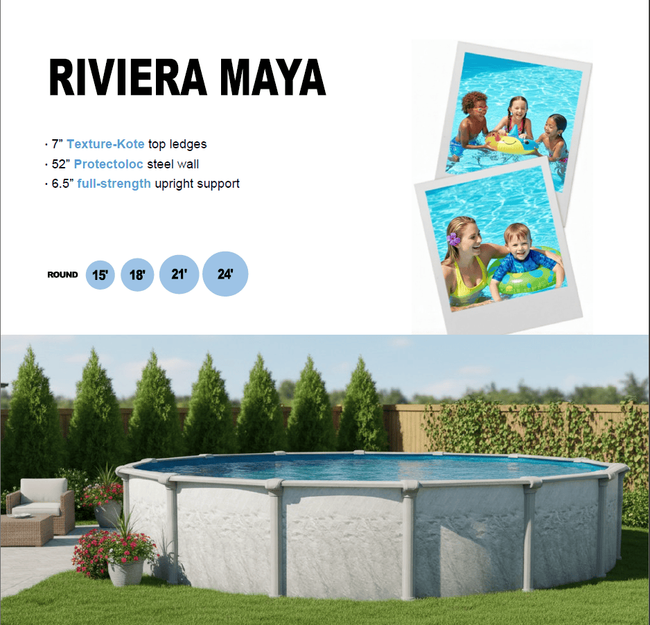 Affordable, durable, and low maintenance, the Riviera Maya pool features a 52″ steel wall with advanced corrosion protection, strong top ledges and uprights, and an aluminum service panel for added longevity. Available in round or oval designs (no buttresses on ovals) and backed by a 40-year prorated warranty, it’s built for years of worry-free family fun.
